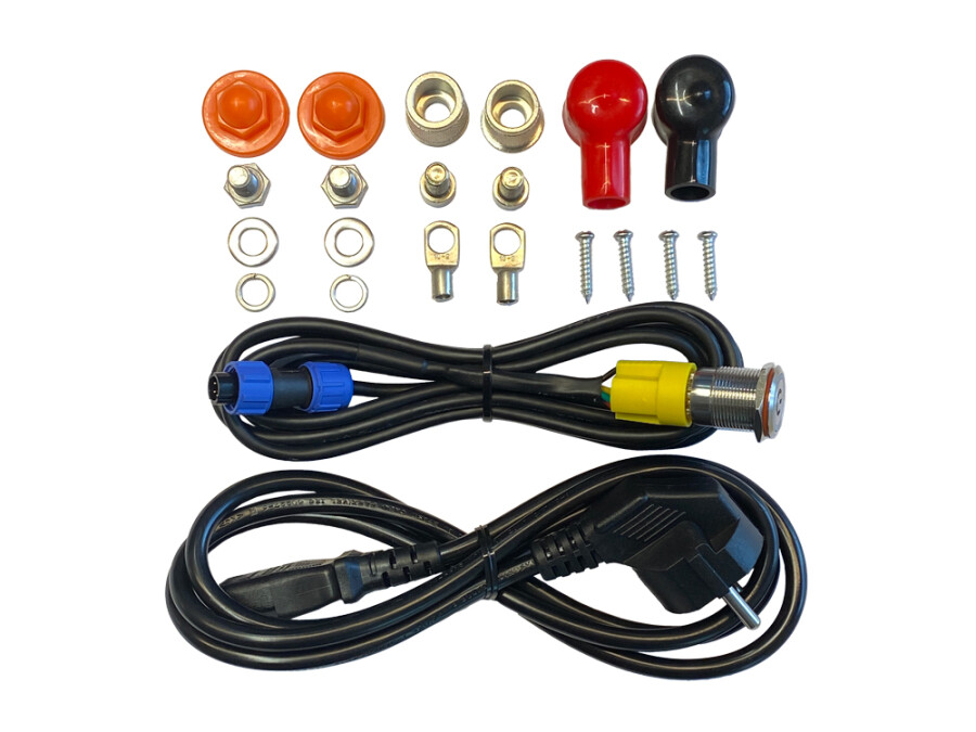 Die Batterie wird mit praktischem Zubehör wie einer Montageplatte, Batterieklemmen, einem Stromkabel und einem verkabelten Ein-/Aus-Schalter für eine einfache Installation und Nutzung geliefert.