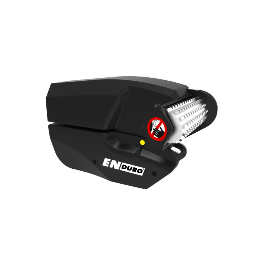 De EM303A+ heeft een spatwater en corrosiebestendig dichte behuizing. Met de afstandsbediening, voorzien van soft start/stop technologie, worden de aandrijfrollen aan- en van de band gekoppeld. De afstandsbediening heeft een softgrip en eenvoudig te bedienen knoppen.
